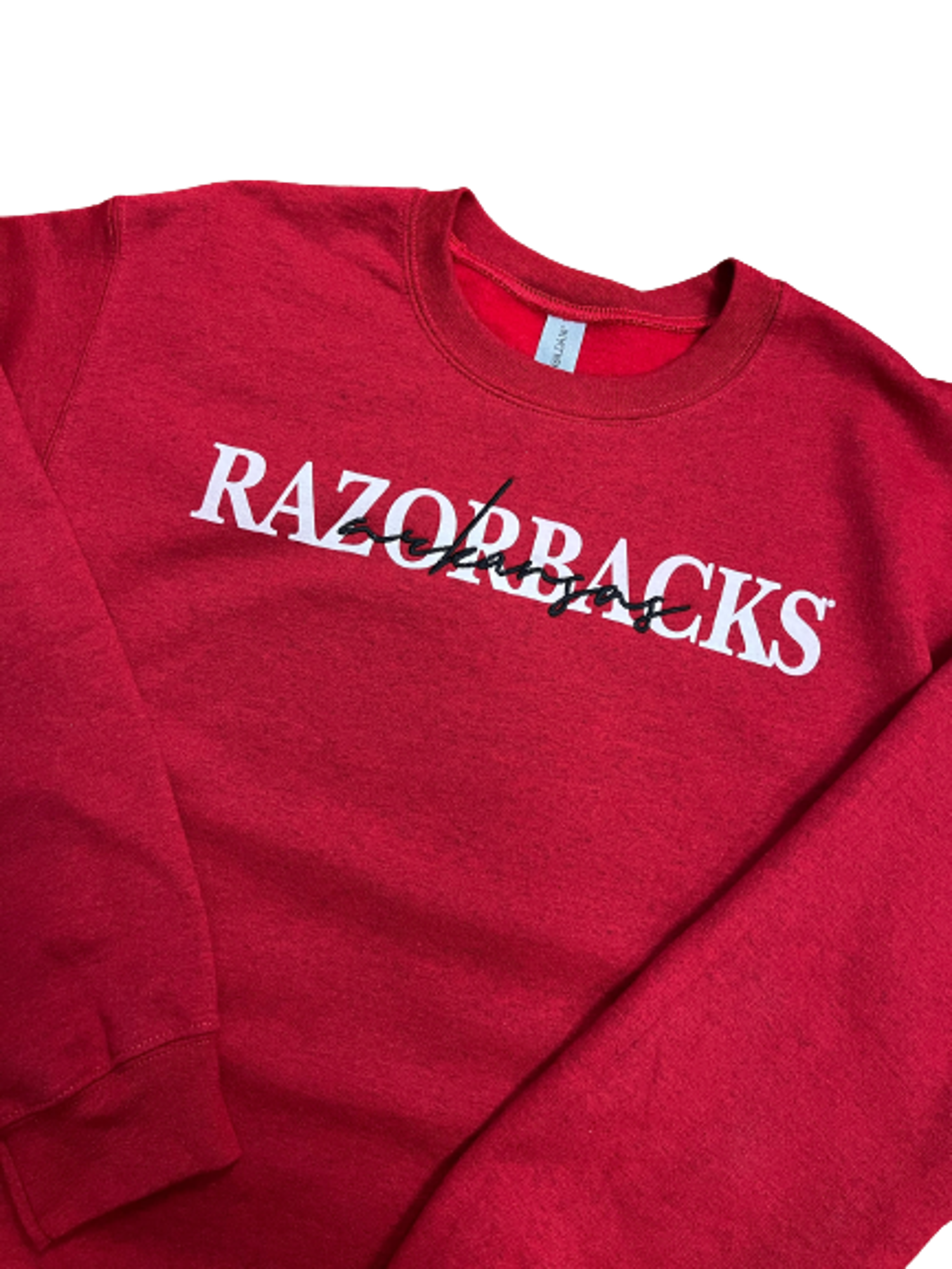 This crewneck is beautifully embroidered with Arkansas Razorbacks on it. Its offered in Grey or Crimson. Stay cozy and support the hogs!