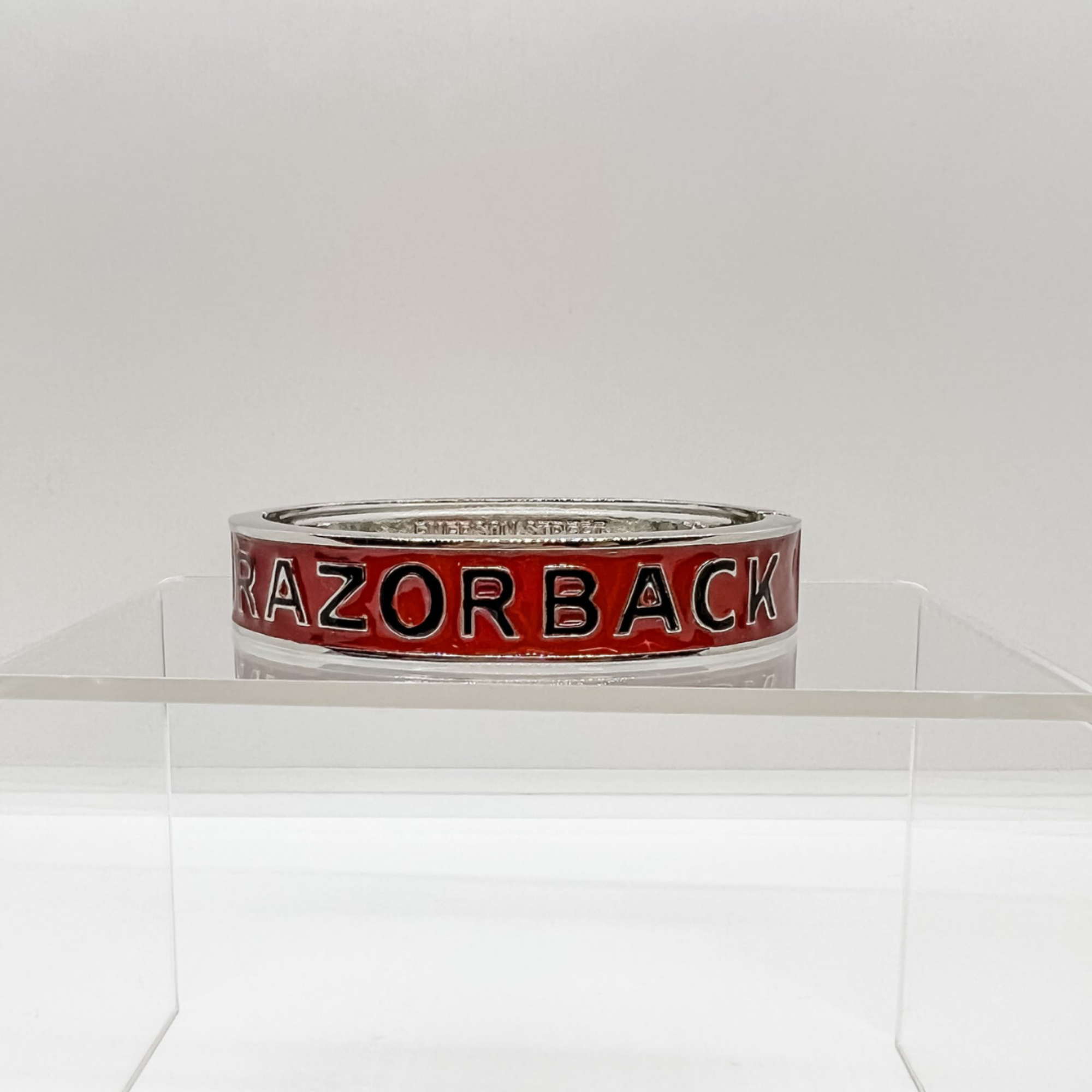 This is the PERFECT bangle for any true hog fan! Show off your Razorback pride with this lightweight, comfortable, versatile, and hand painted enamel University of Arkansas bangle. Pair with any tailgate gear and call those hogs! This one is silver plated! *Please note that all Jewelry is Final Sale.*