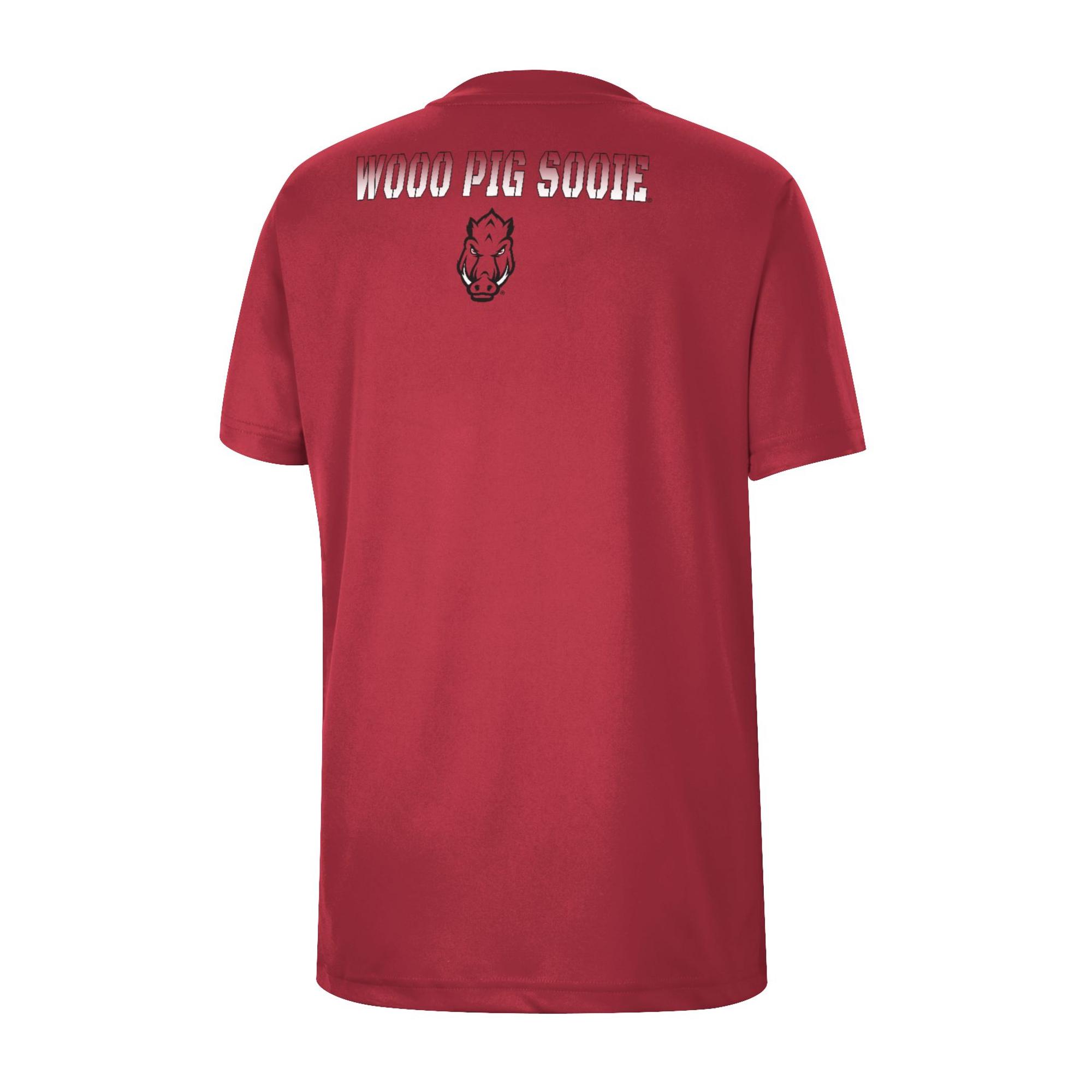 This youth t shirt is dry fit and has Arkansas Razorback written across the front. It has a running hog underneath Arkansas Razorbacks. On the back of the shirt it says wooo pig sooie and a front facing hog. This shirt is perfect for your kids to cheer on the hogs on gamedays!