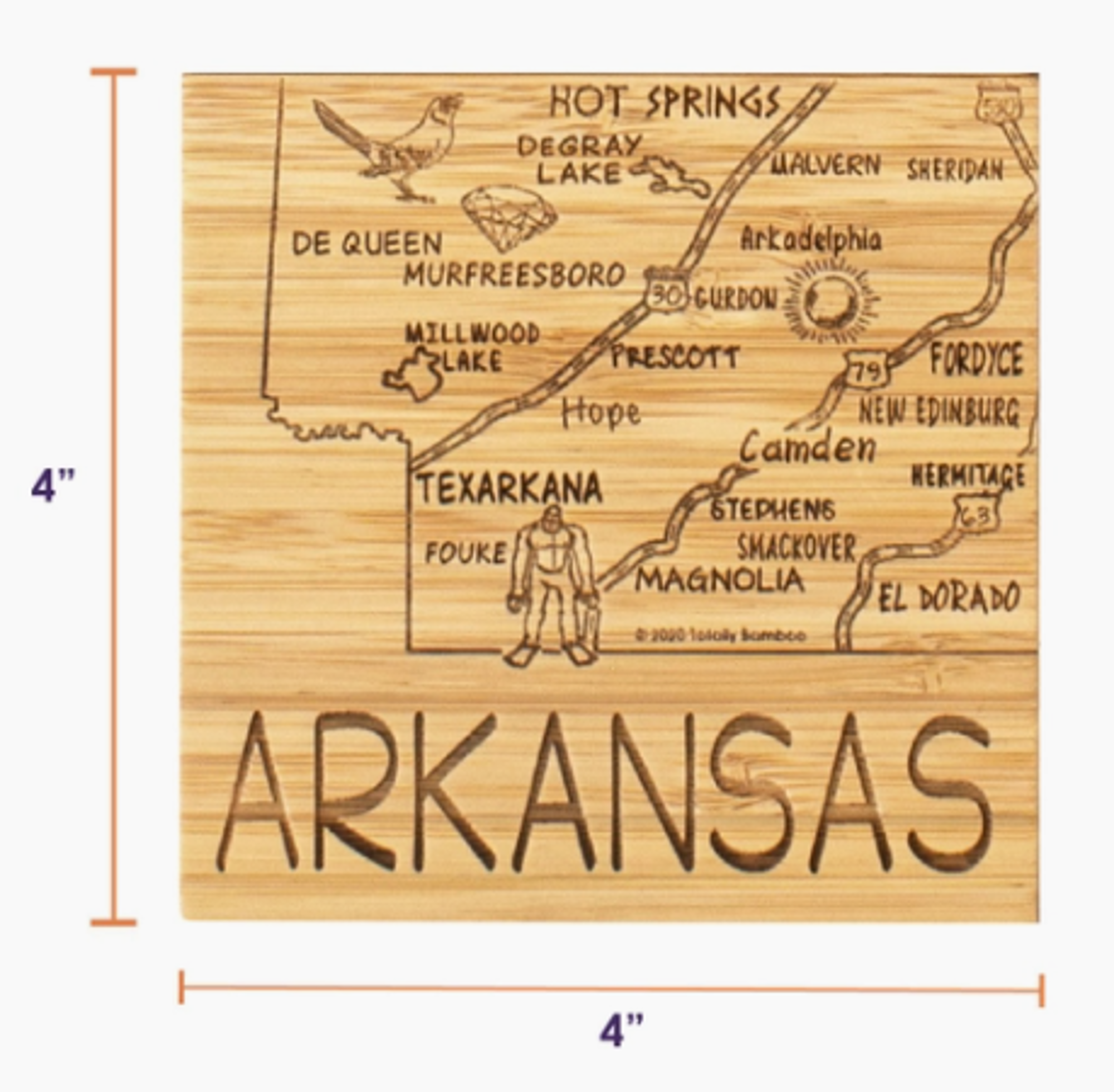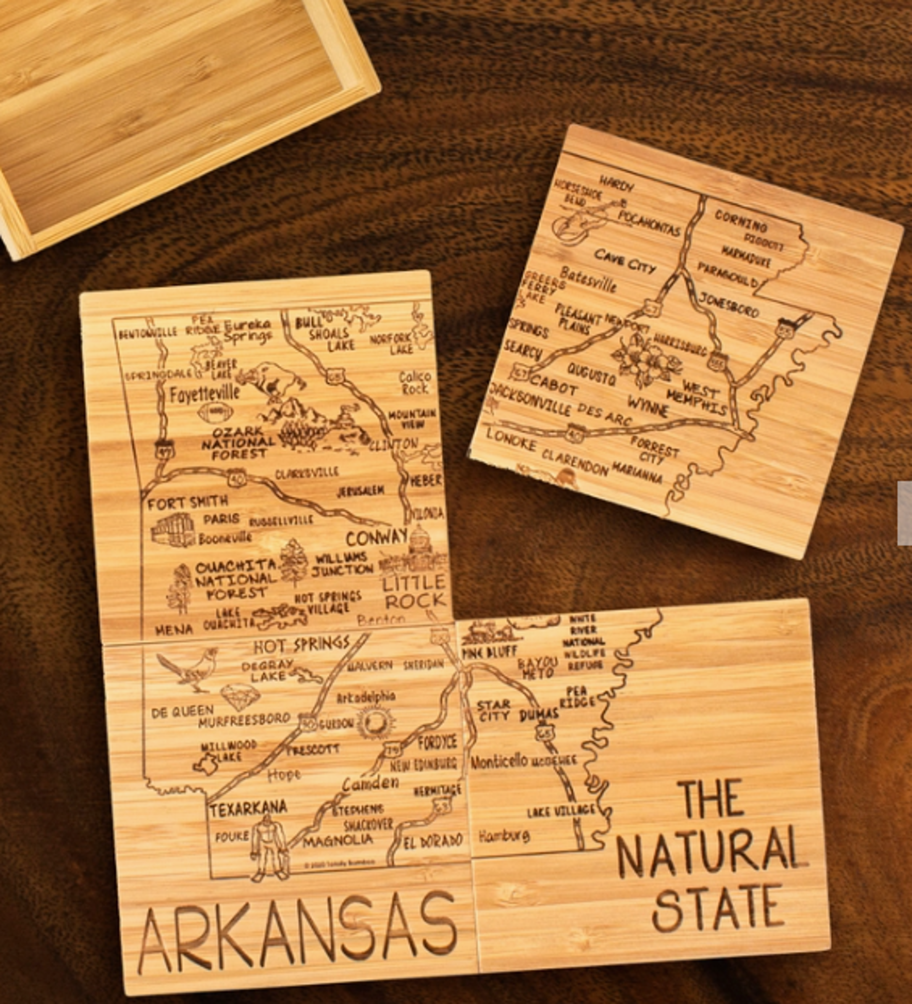We've split The Natural State across four bamboo coasters! When the coasters are pushed together the complete the "puzzle" and show the full artwork of Arkansas. Each coaster set includes a bamboo case for neat storage and a small in-store footprint. Great to be sold either for entertaining at home or as a gift! Coasters measure 4" x 4". Made in China.