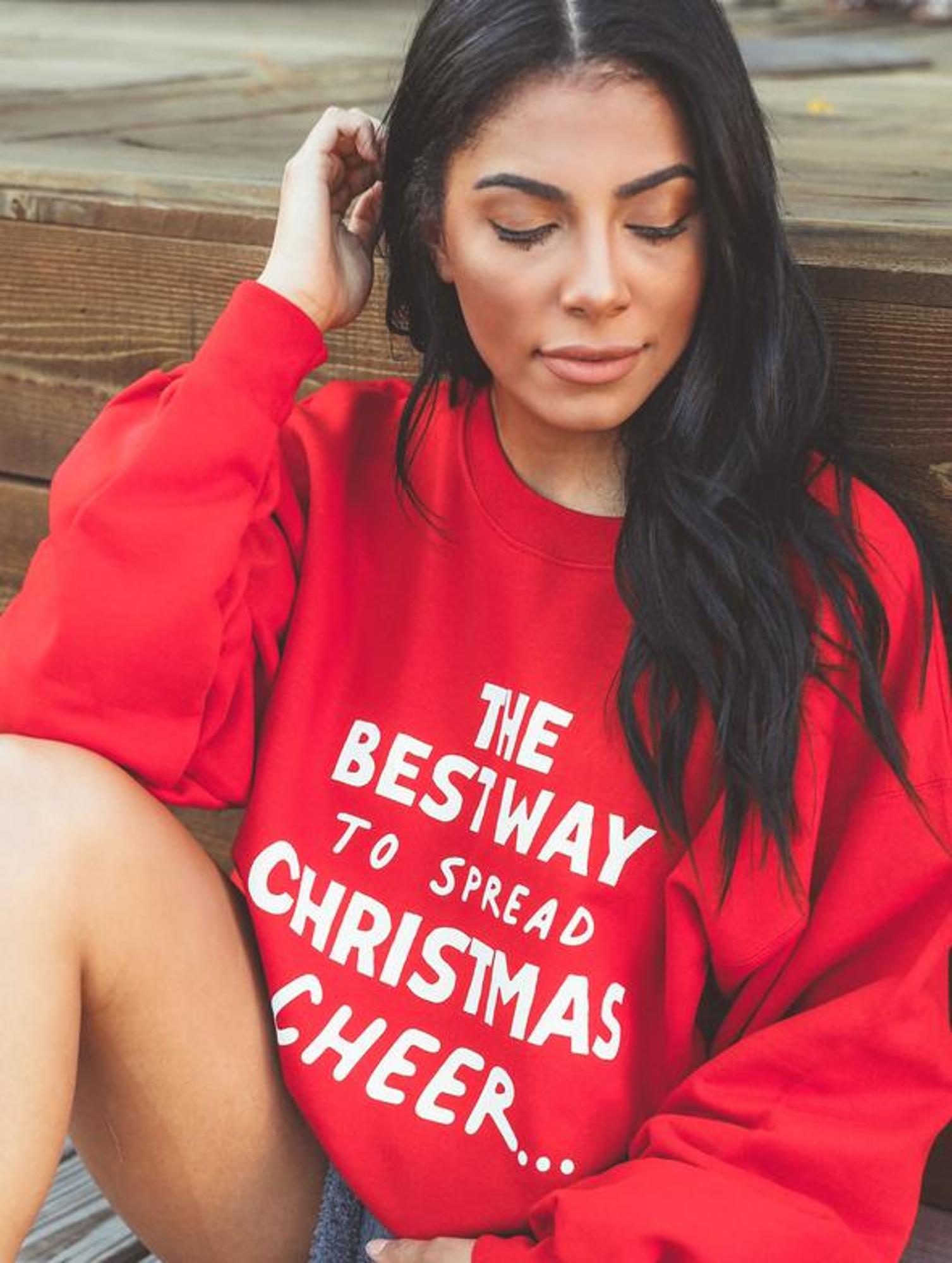 One of the best ways to spread christmas cheer....is wearing this sweatshirt cuddled up on the couch watching christmas movies! this cozy piece features a fun font on a candy apple red sweatshirt! (p.s. Buddy the Elf recommends it :) )
